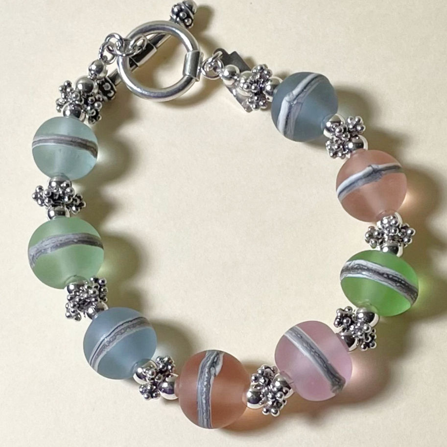 B230 Etched Transparent Earth Tone Pillow Bead Bracelet Silvered Ivory Trim